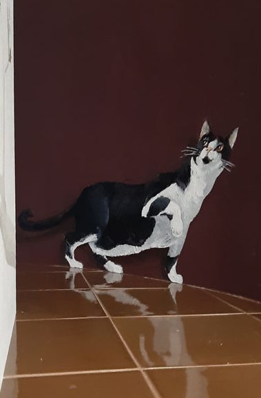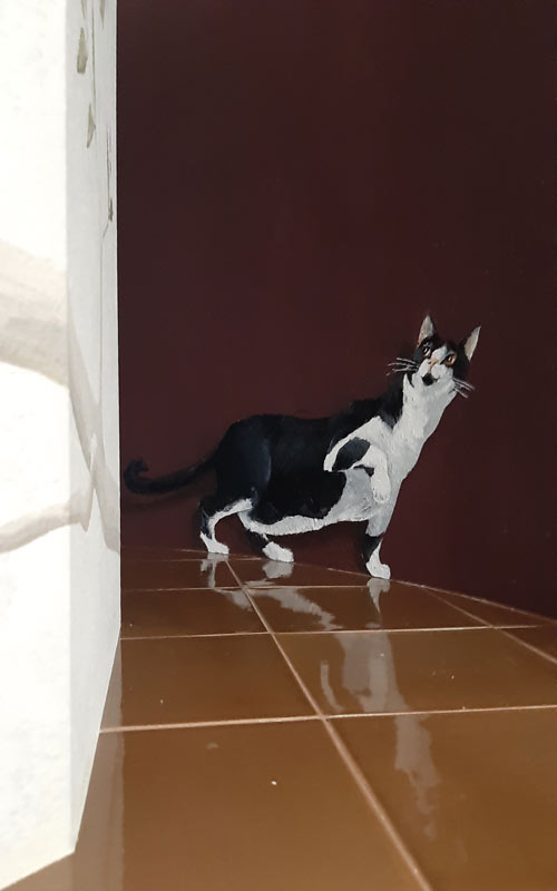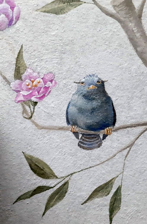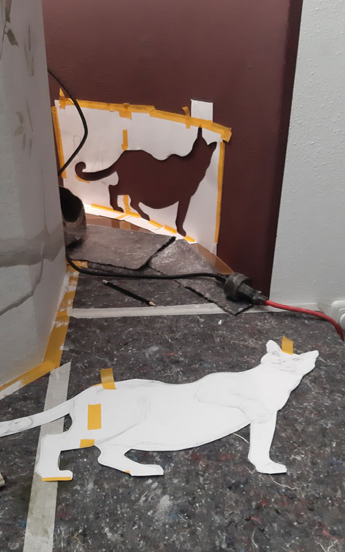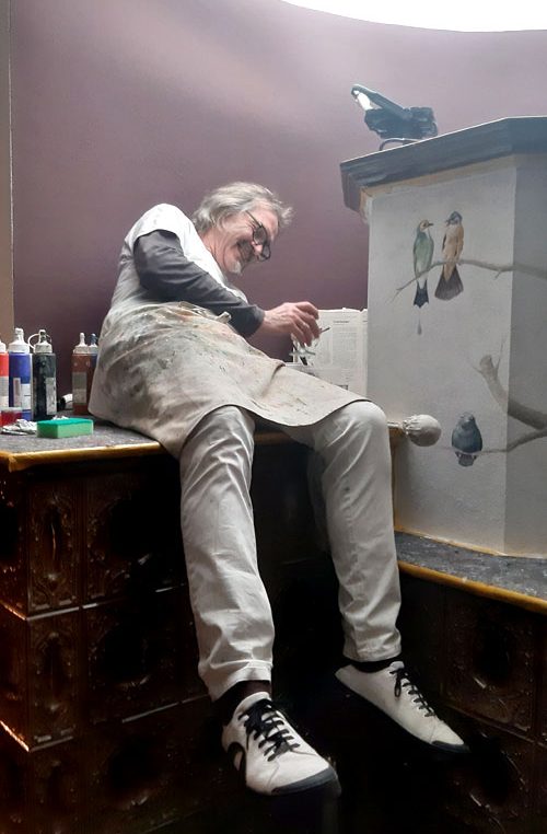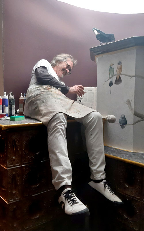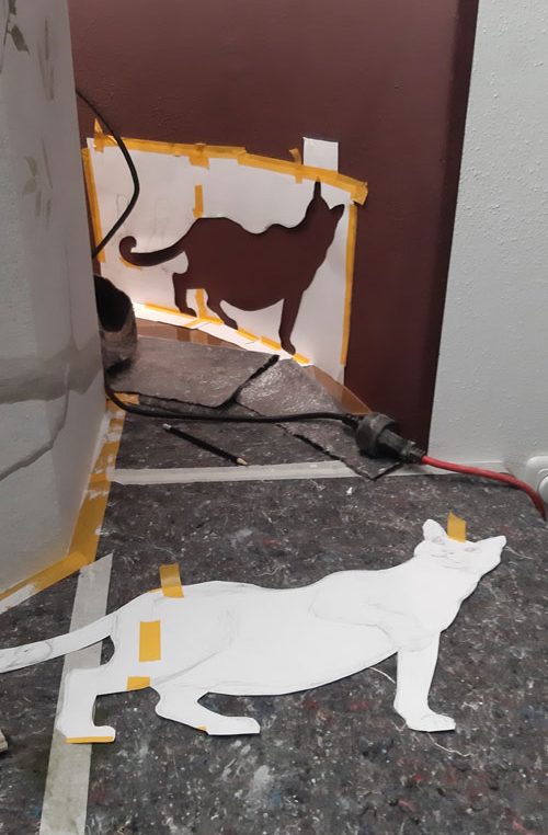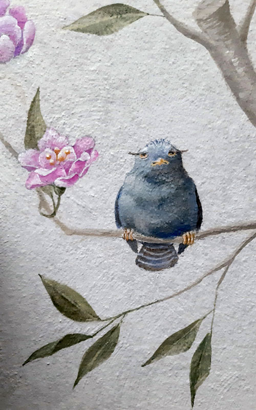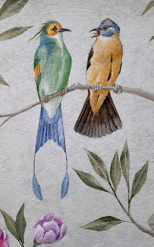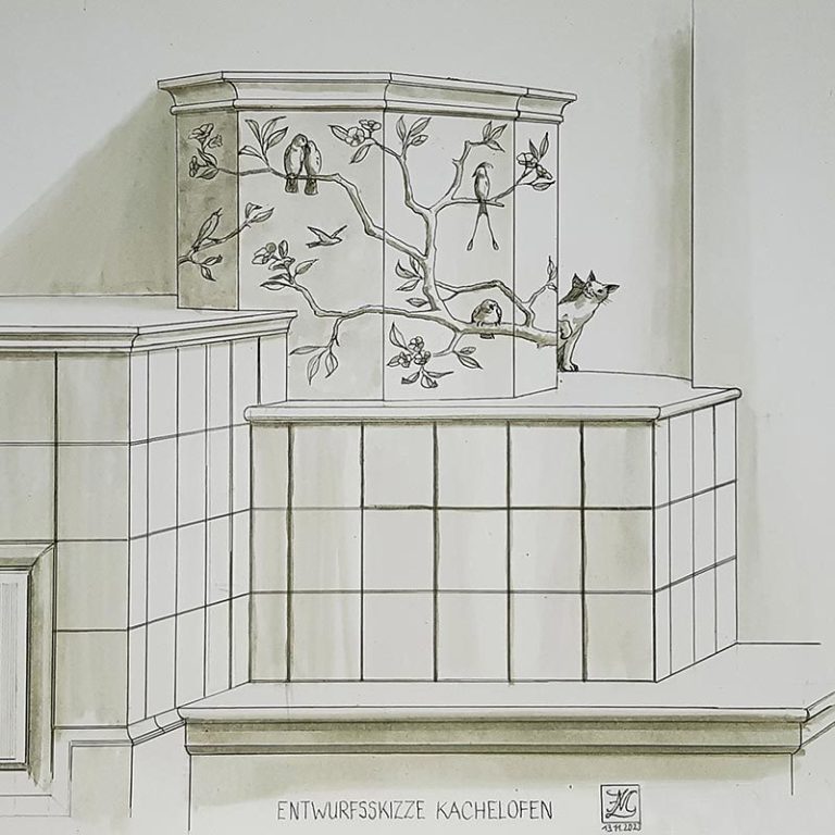 Der Kaminaufsatz wirkte etwas farblos und sollte mehr in den Raum integriert werden. Unser Vorschlag – eine dezente Dekorationsmalerei mit Vögeln und Hauskatze “ Flitzie“.