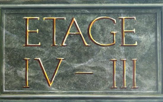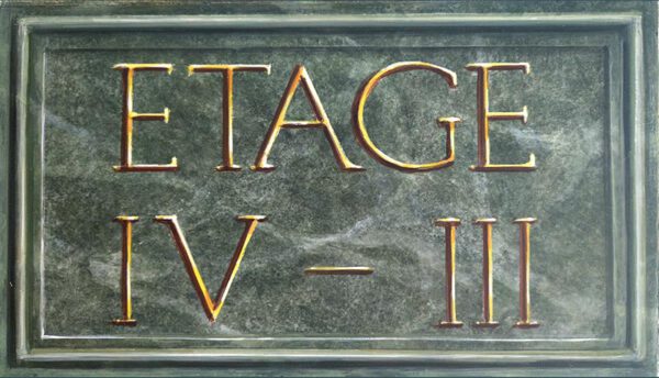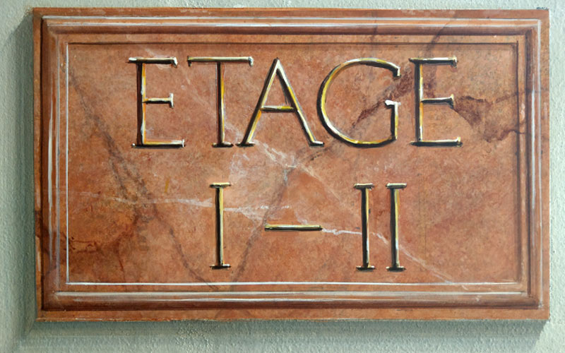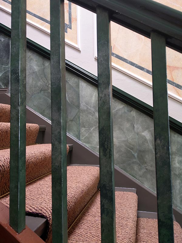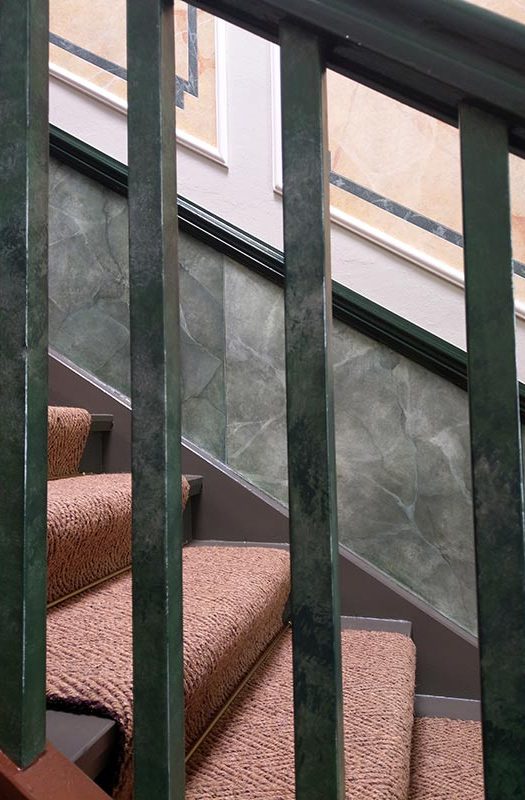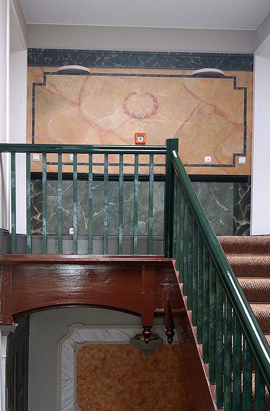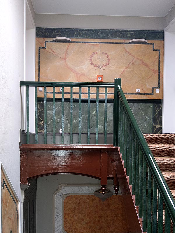 Marmor mit grünen Einlegern, eingerahmt von Stuckelementen, im unteren Bereich grüner Marmor. Das braun gestrichene Treppengeländer passte nun nicht mehr ins Konzept. Die Farbgebung des unteren Bereichs wurde aufgenommen und damit dreifarbig abgetupft.
