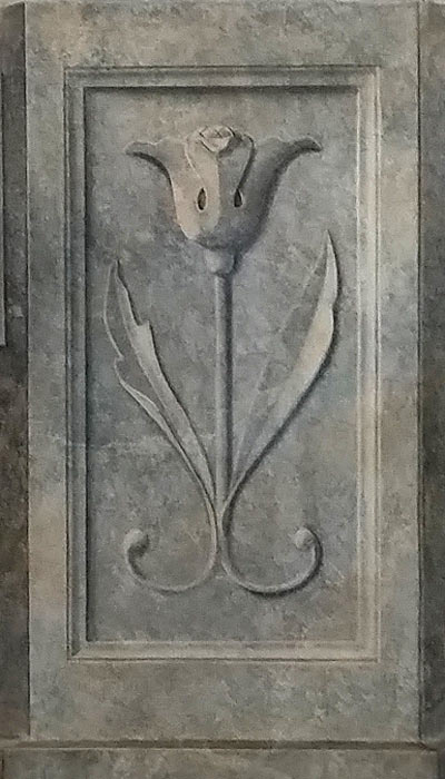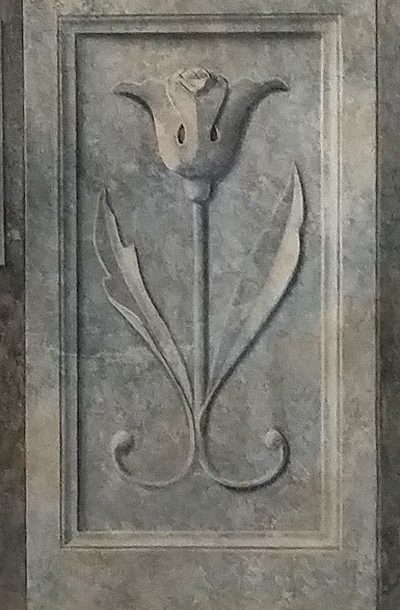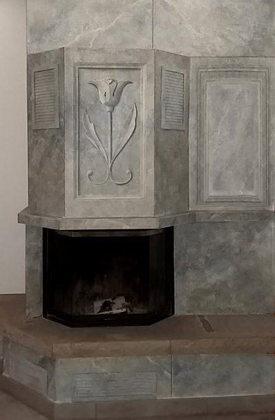 Die Umbauung des Kamins wurde mit einer Marmorimitation optisch veredelt. Kassetten und ein stilisiertes Blütenrelief lockern die gegebene Geradlinigkeit auf.