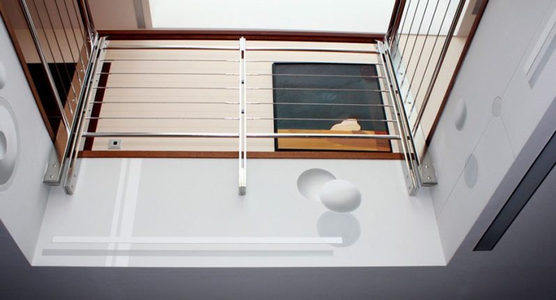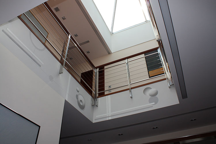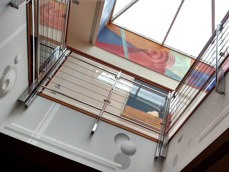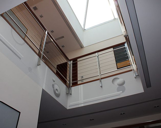 Passend zur gradlinigen Architektur des Baukörpers, wurde die Deckenöffnung des Atriums mit einer reduzierten Formsprache gestaltet.