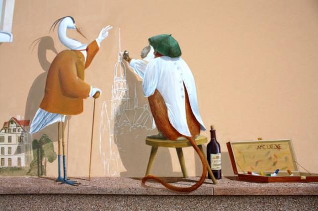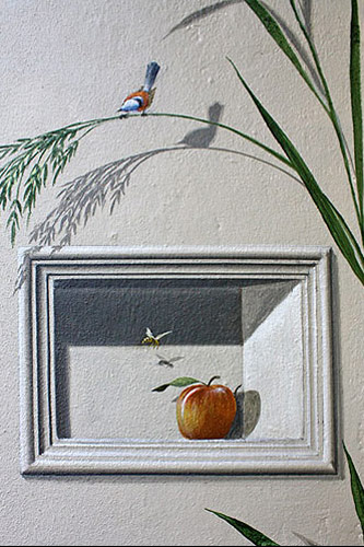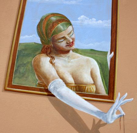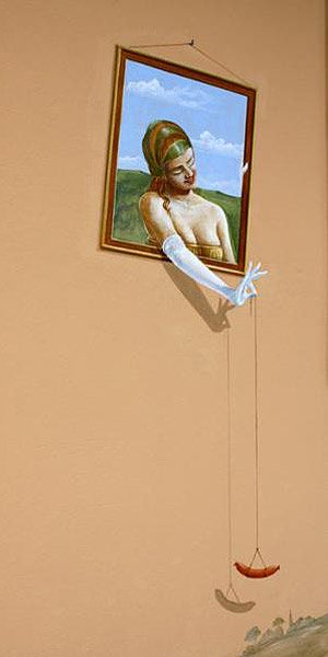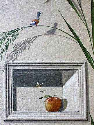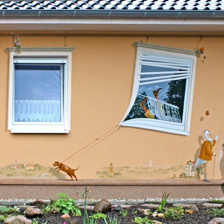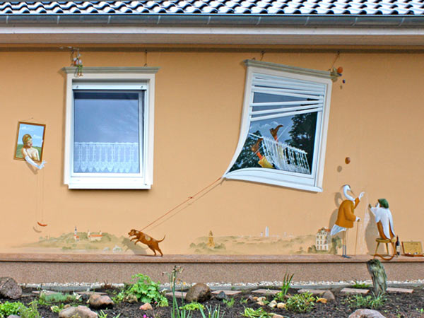 Diese Fassadengestaltung wurde im klassischen Stil der Illusionsmalerei ausgeführt.