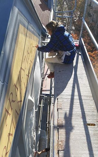 Nach unserem Entwurf ließen wir das Werbeschild entfernen und die zu bemalende Fläche nach vorgegebenem Umriss spachteln.