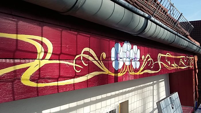Dieser schönen Jugendstilvilla gaben wir den letzten Schliff mit einer zurückhaltenden Malerei am Dachkasten. Auf dem dunklen Rotton des Untergrundes kommt das Farbenspiel des floralen Motives besonders gut zur Geltung. Die üppigen blauen Blüten bilden hierbei einen gelungenen Farbkontrast.