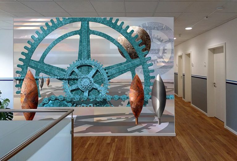 Durch den gezielten Einsatz von metallenen Oberflächen und Strukturen visualisiert das Wandbild die Identität des Unternehmens.