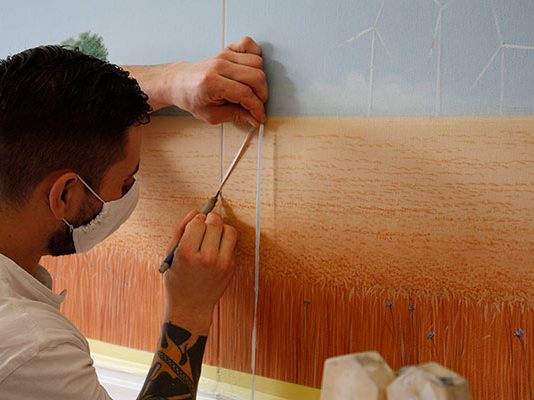 Präzisionsarbeit bei der Anbringung des Wandbildes