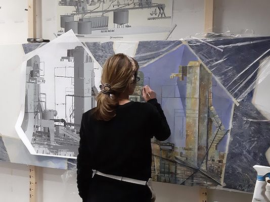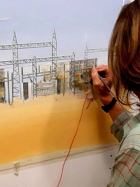 Die malerische Darstellung eines Umspannwerkes und die Vorgaben des Auftragebers bedeuten für uns eine Herausforderung und so machen wir uns elektrisiert an die Arbeit.