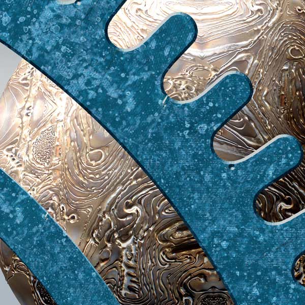 Durch den gezielten Einsatz von metallenen Oberflächen und Strukturen visualisiert das Wandbild die Identität des Unternehmens.