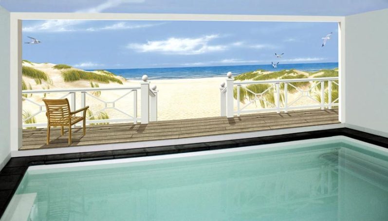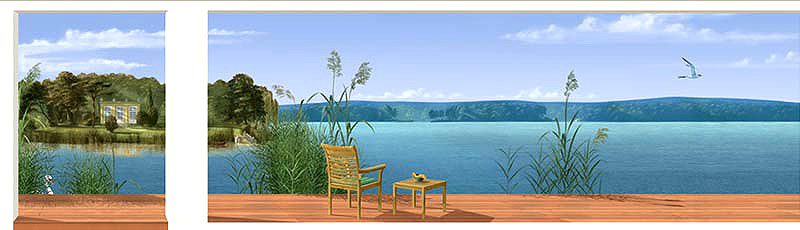 Die 16,5 m lange Betonwand der Schwimmhalle wurde mit einer Wandgestaltung versehen, die die natürliche Aussicht auf den See illusionistisch weiterführt. Um dem langgestreckten Raum eine größere Tiefe zu verleihen, haben wir den vorhandenen Holzboden optisch aufgenommen und als Terrasse im Bild weitergeführt.