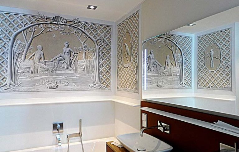 Für ein Badezimmer schufen wir ein dreiteiliges Wandbild mit dem Thema “ Diana im Bade „. Das Bild ist für eine Badewannennische konzipiert und in unserem Atelier auf Leinwand als Grisaille (Graumalerei) ausgeführt worden.