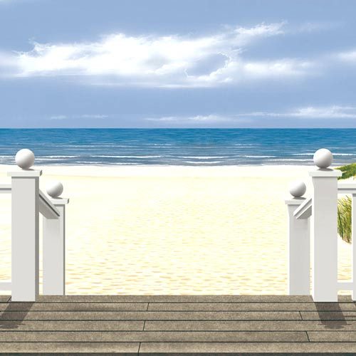 Der Abgang zu einem tiefer gelegenen Teil der Terrasse durchbricht die strenge Gliederung der Balustrade und lädt den Betrachter dazu ein, gleich wie die steinerne Figur auf dem Postament, den Blick über die Küste und das weite Meer schweifen zu lassen.
