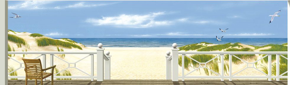 Dieses Wandbild wurde in unserem Atelier auf Leinwand gemalt und dann innerhalb weniger Stunden vor Ort an der Wand angebracht. Der baulich begrenzte Raum gewinnt durch die Weite des Horizonts an Tiefe.