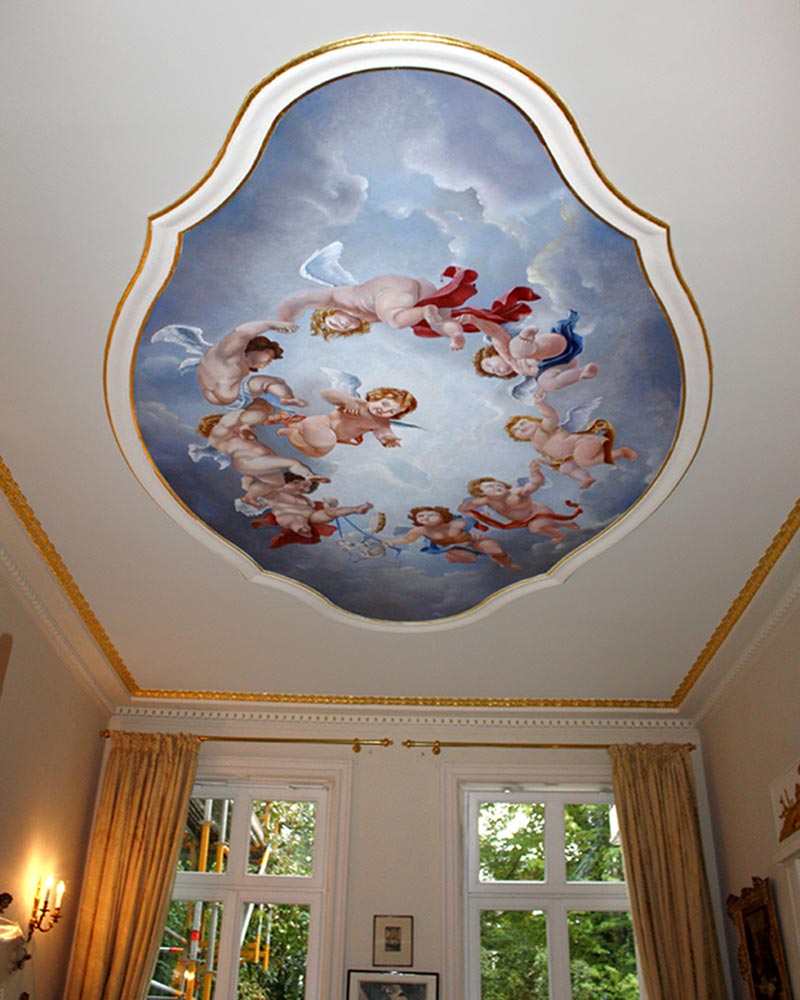 In einer Hamburger Gründerzeitvilla fertigten wir auf Wunsch einen Deckenhimmel in Anlehung an Rubens Puttenreigen. Die besondere Vorliebe der Kundin für Theater und Musik haben wir mit entsprechenden Attributen dargestellt .