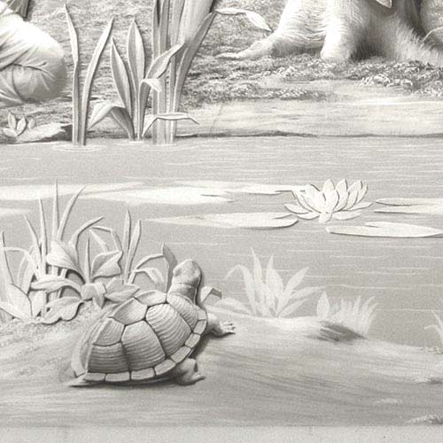 Im minimalistisch gehaltenen Wandbild sind präzise ausgearbeitete Details plaziert, die den Betrachter immer wieder Neues entdecken lassen